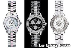 Oben links, die Girly-Version verfügt über ein kleineres Zifferblatt (28mm) und ein Stahlarmband mit einer Reihe von rosa Kristallglas für eine schrecklich feminine Uhr. In der Mitte kombiniert der außergewöhnliche Chronograph Christal mit seinen 488 Diamanten Uhrmacherkunst mit höchster Raffinesse. Auf der rechten Seite ist der weiße Christal mit seinem 33-mm-Zifferblatt mit 182 Diamanten und seinem Armband mit drei Reihen aus weißem Saphirglas von tadelloser Eleganz.